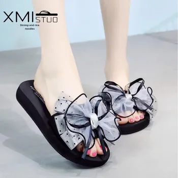 รองเท้าแตะส้นแบนกันลื่นสำหรับผู้หญิงแฟชั่นใหม่ฤดูร้อนรองเท้าแตะชายหาดผูกโบว์ทำด้วยมือแบบลำลองแบบสวมปิดสำหรับกลางแจ้ง